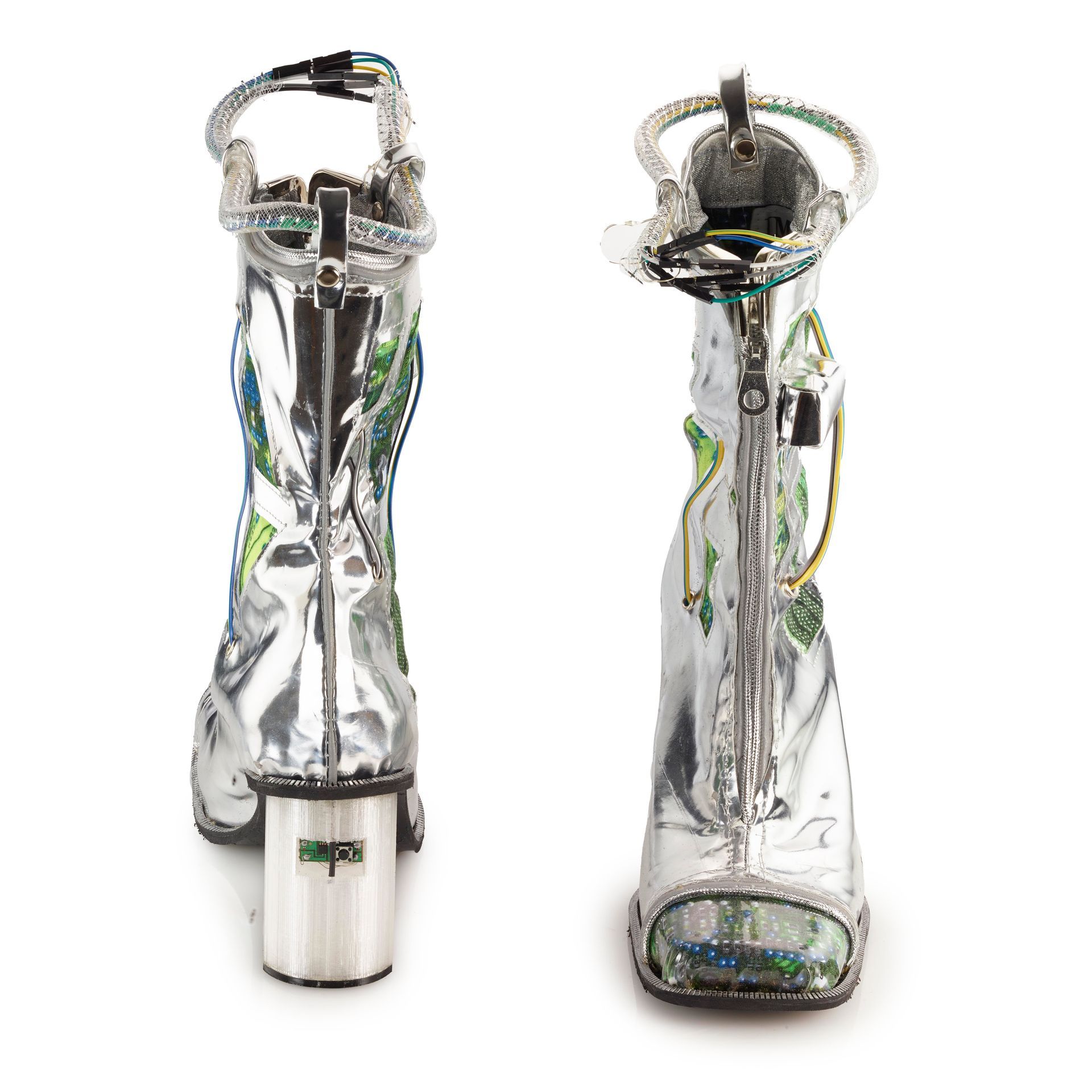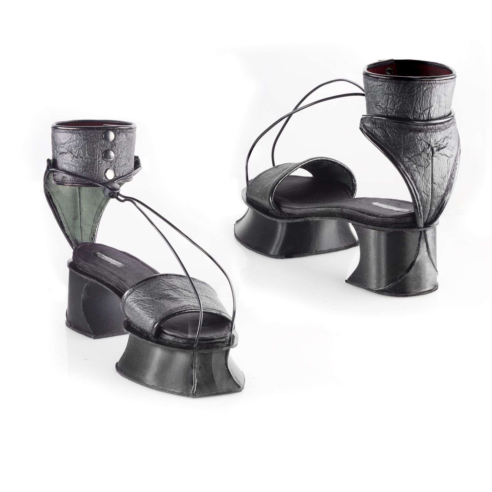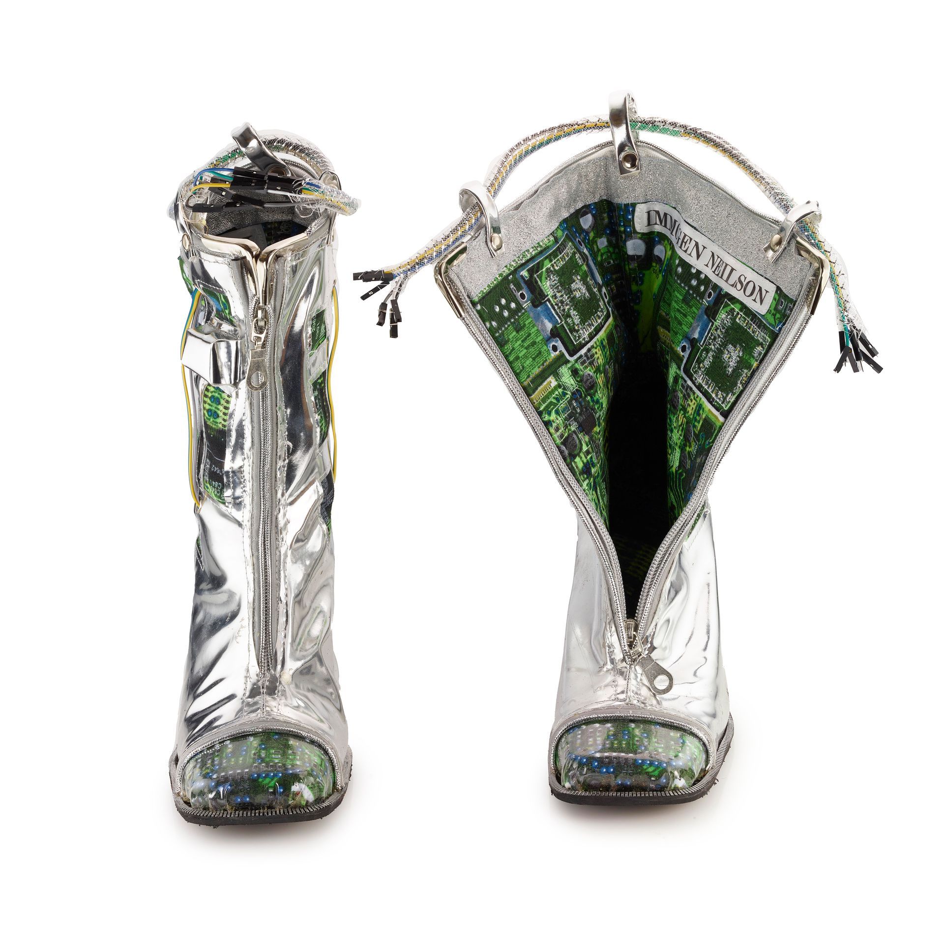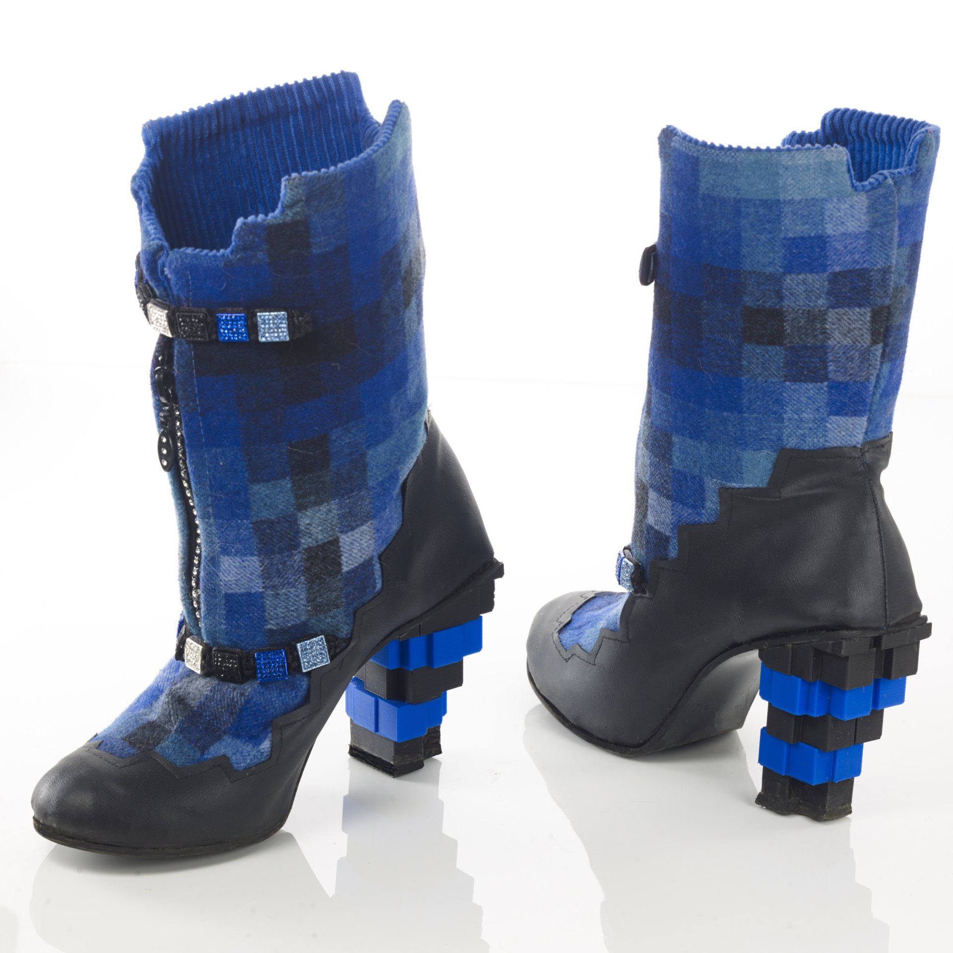 Eilidh's theme for her outfit and shoe designs bore elements from David Bowie. Eilidh designed the shoes and together we worked them into a manageable production with the tools and supplies available. I enjoyed the challenge this commission brought, having to find new techniques for building some designs, including the challenge of designing a unique platform and heel for the sandal. The shoes complimented her outfits perfectly.